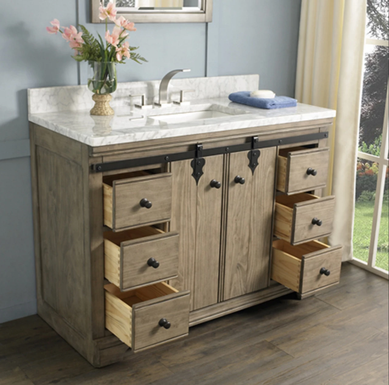 The form is familiar, but the approach is new. That’s the Homestead vanity; combining classic lines with a warm, Windswept Pine Finish. It’s fresh, country look with an earthy vibe. Decorative, dark escuthceon-like details on the middle doors add definition to the Antique Black knobs. Never losing its classical foothold, the design steps into the present with a new, country chic attitude.