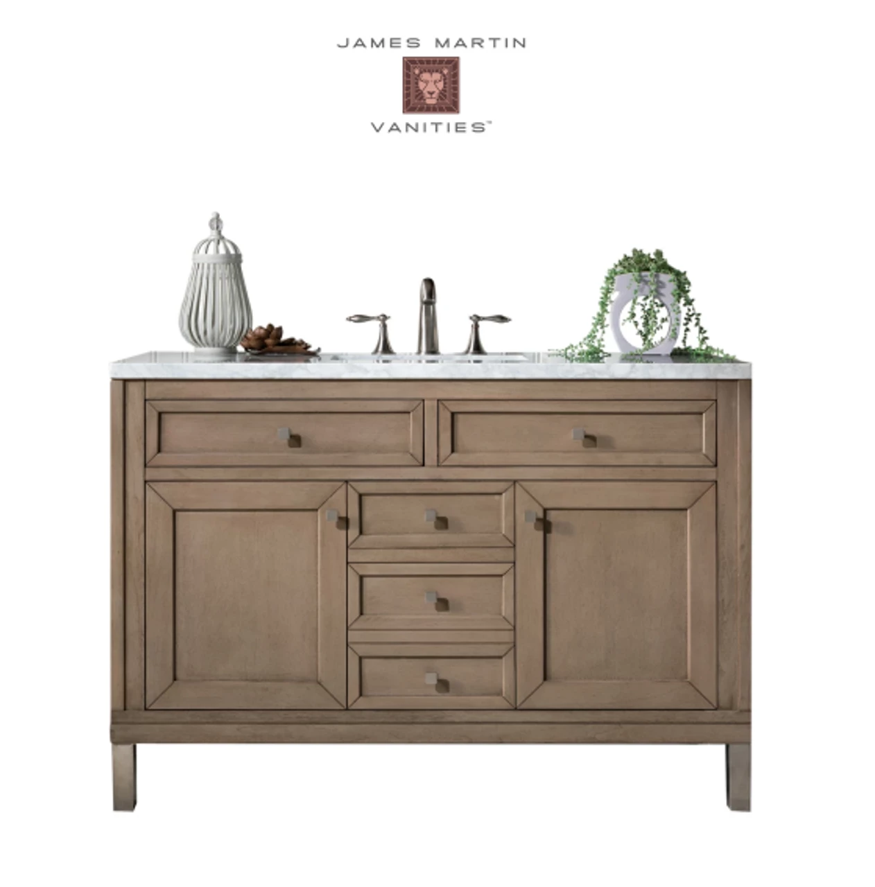 The Chicago 48″ single sink vanity by James Martin Vanities is a wall-mount optional cabinet with mounting brackets and optional legs. This cabinet features tip out drawers for added storage space, soft-close door hinges, and soft-close drawer glides. The look is completed with a classic vanity top by Silestone and premium solid surface sink.