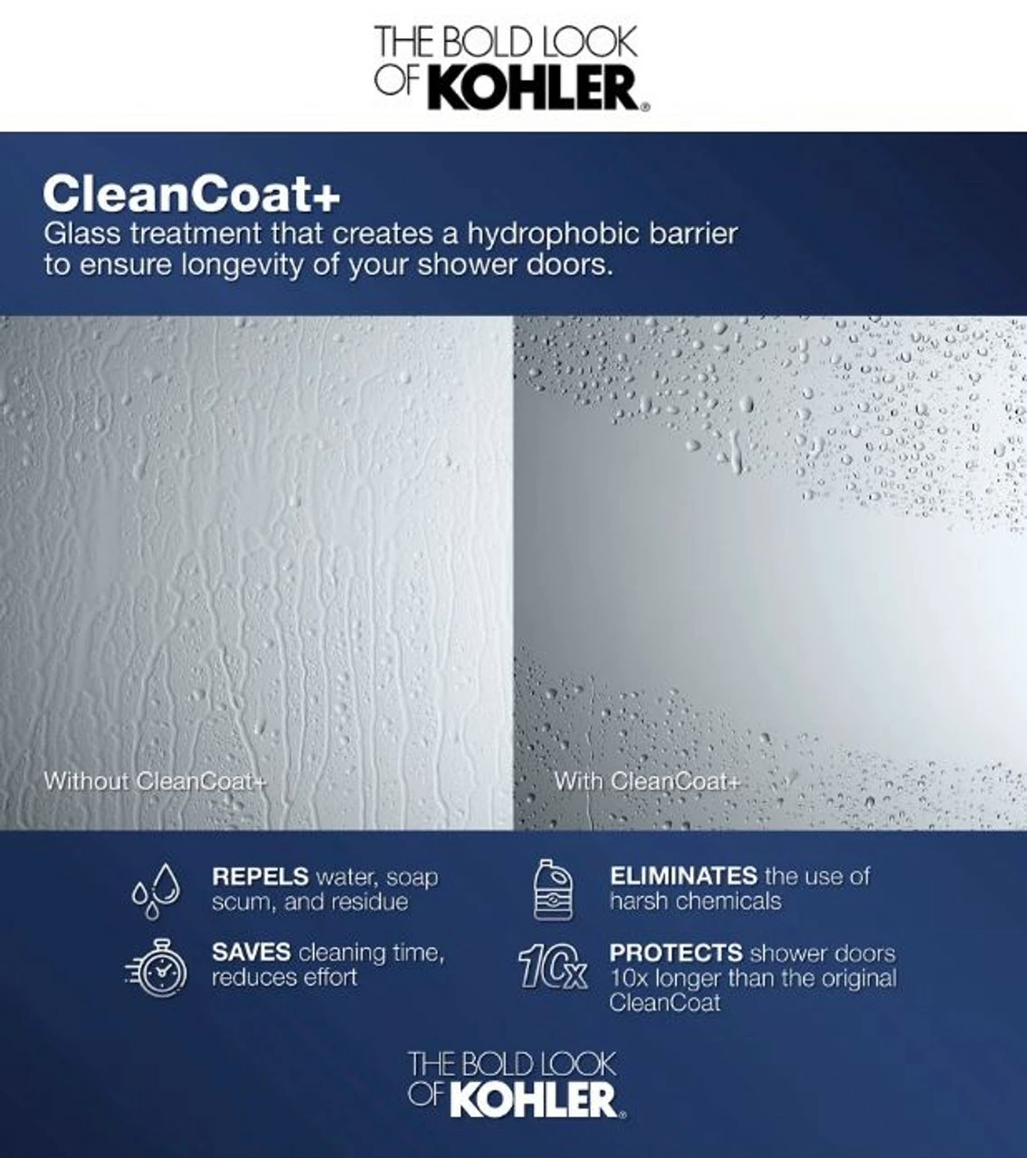 - CleanCoat®: Glass treatment on shower doors repels water for improved ease of cleaning