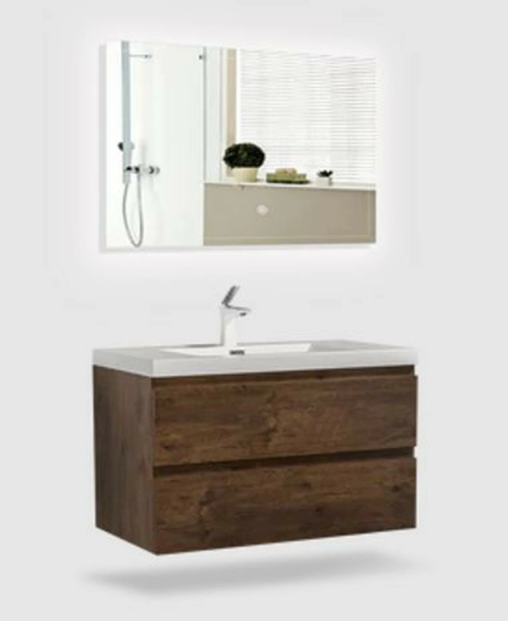 Wood Stained Finish Cabinet with Black Counter Top Sink with Soft Close drawers.