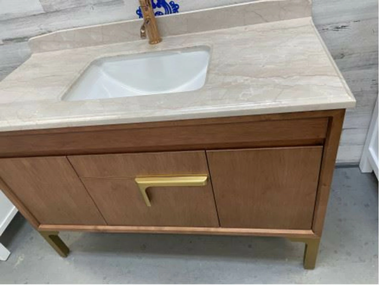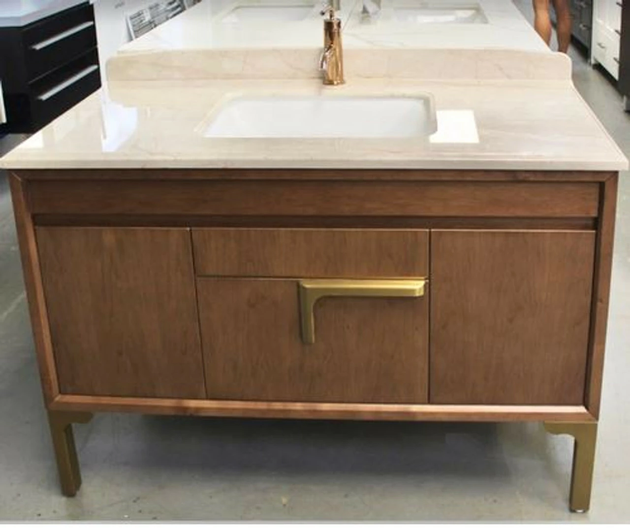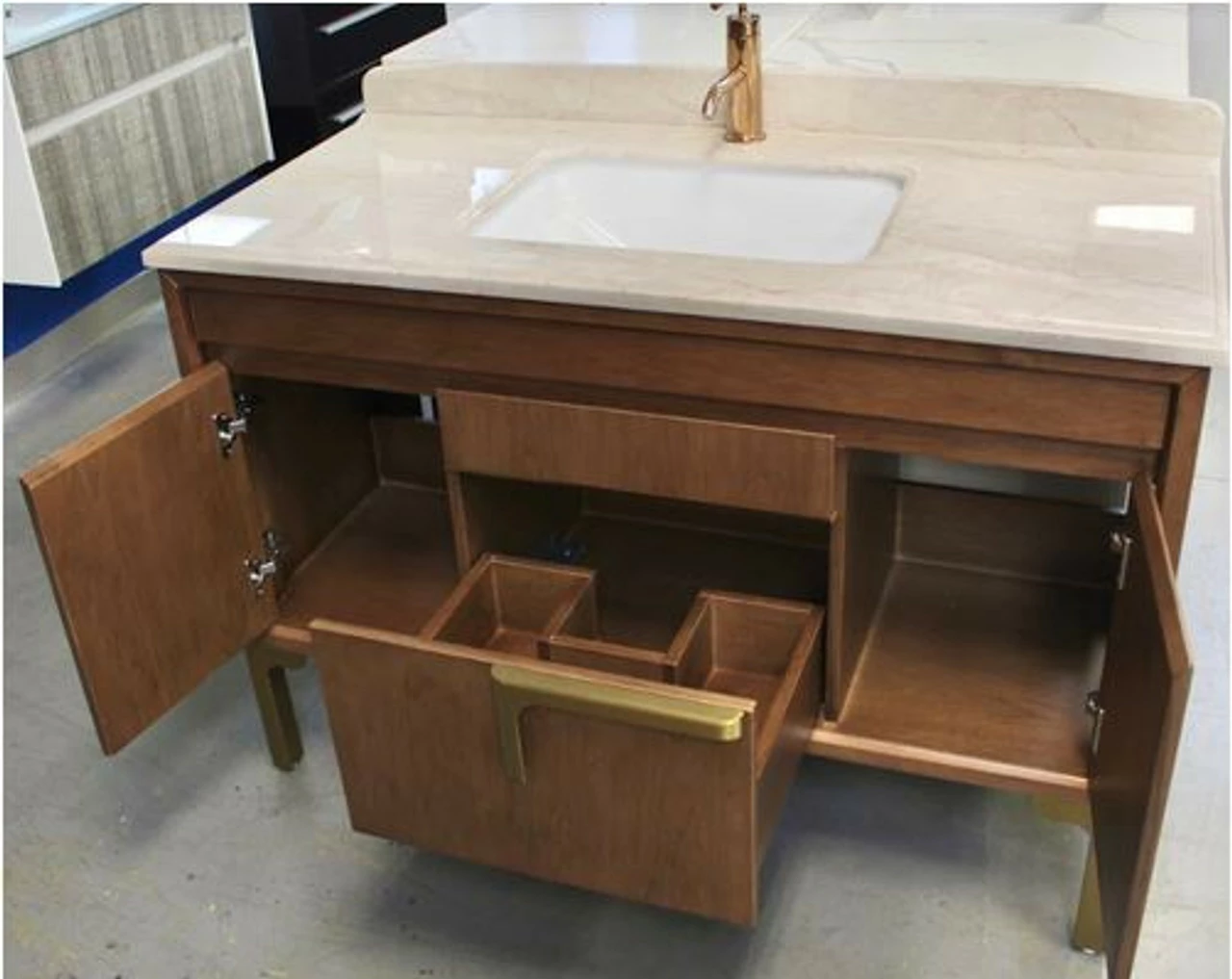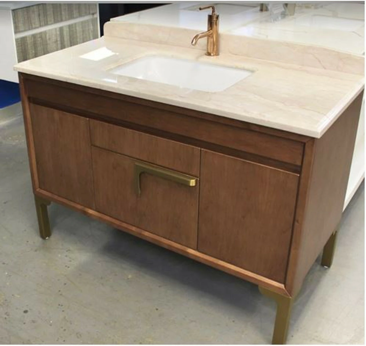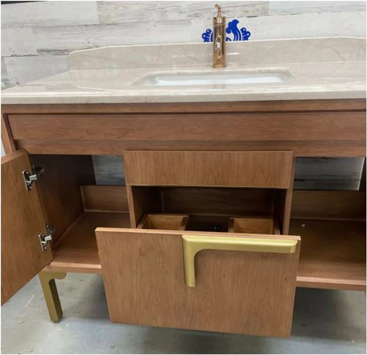 Lucas Design Italian Designer Collection gives Style, function, versatility, the Lucas Design vanity will be the cornerstone of your bathroom, providing ample storage space for your essentials, doors and drawers. Featuring clean lines, the Lucas Design embraces a transitional aesthetic that is timeless and pure. The trendy antique brass finish base accents with matching finish door/drawers pull to complete the look.