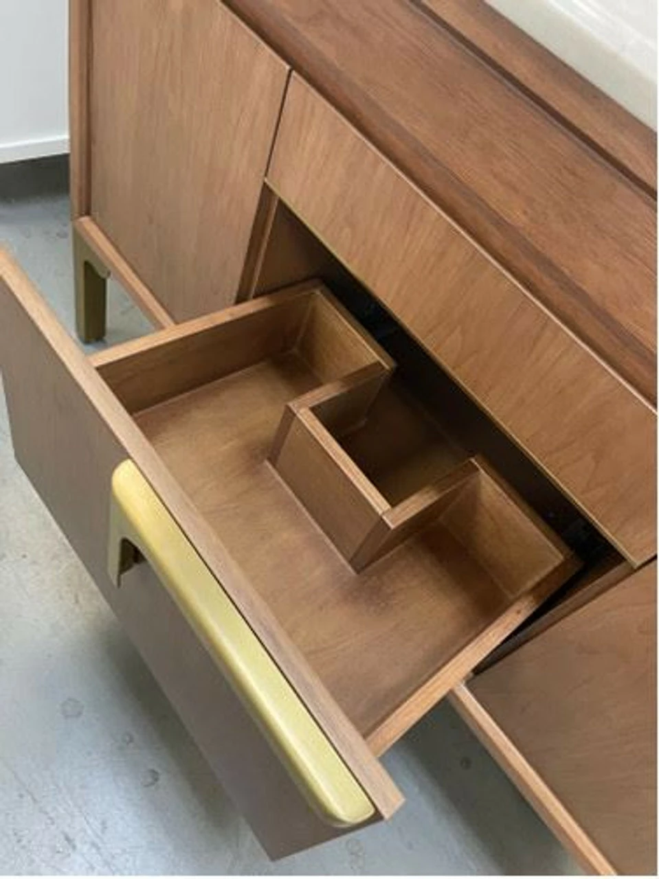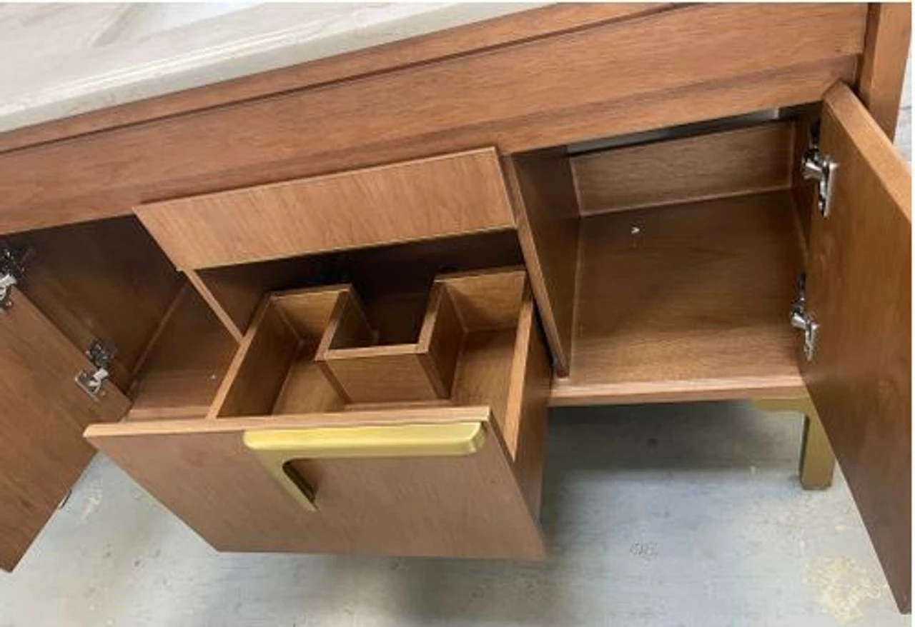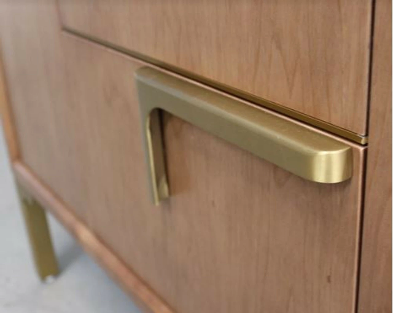 - Trendy antique brass finish door/drawer pulls and cabinet base