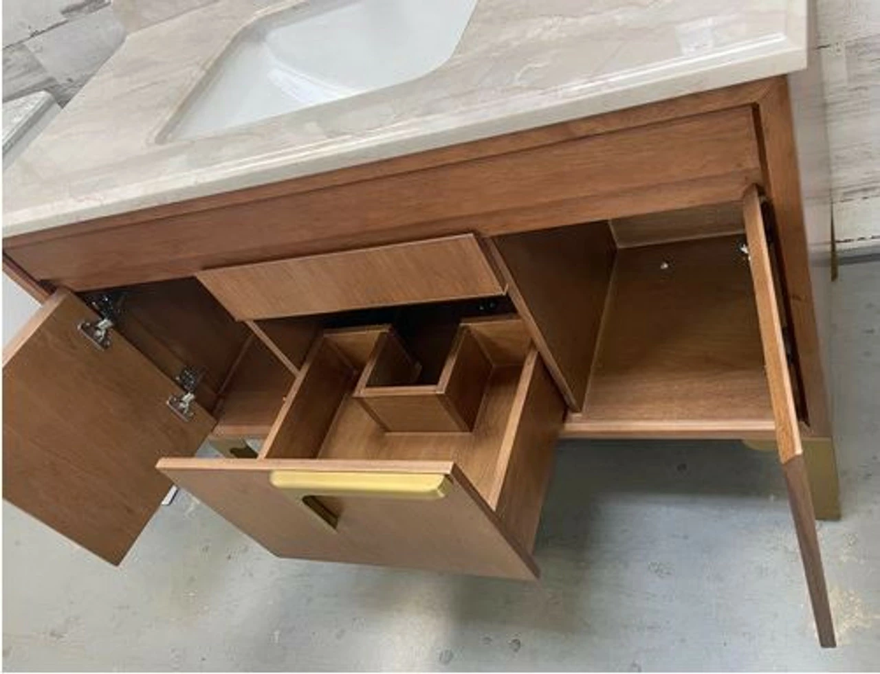 - Materials: solid wood cabinet, quartz stone counter-top, ceramic sinks with overflow