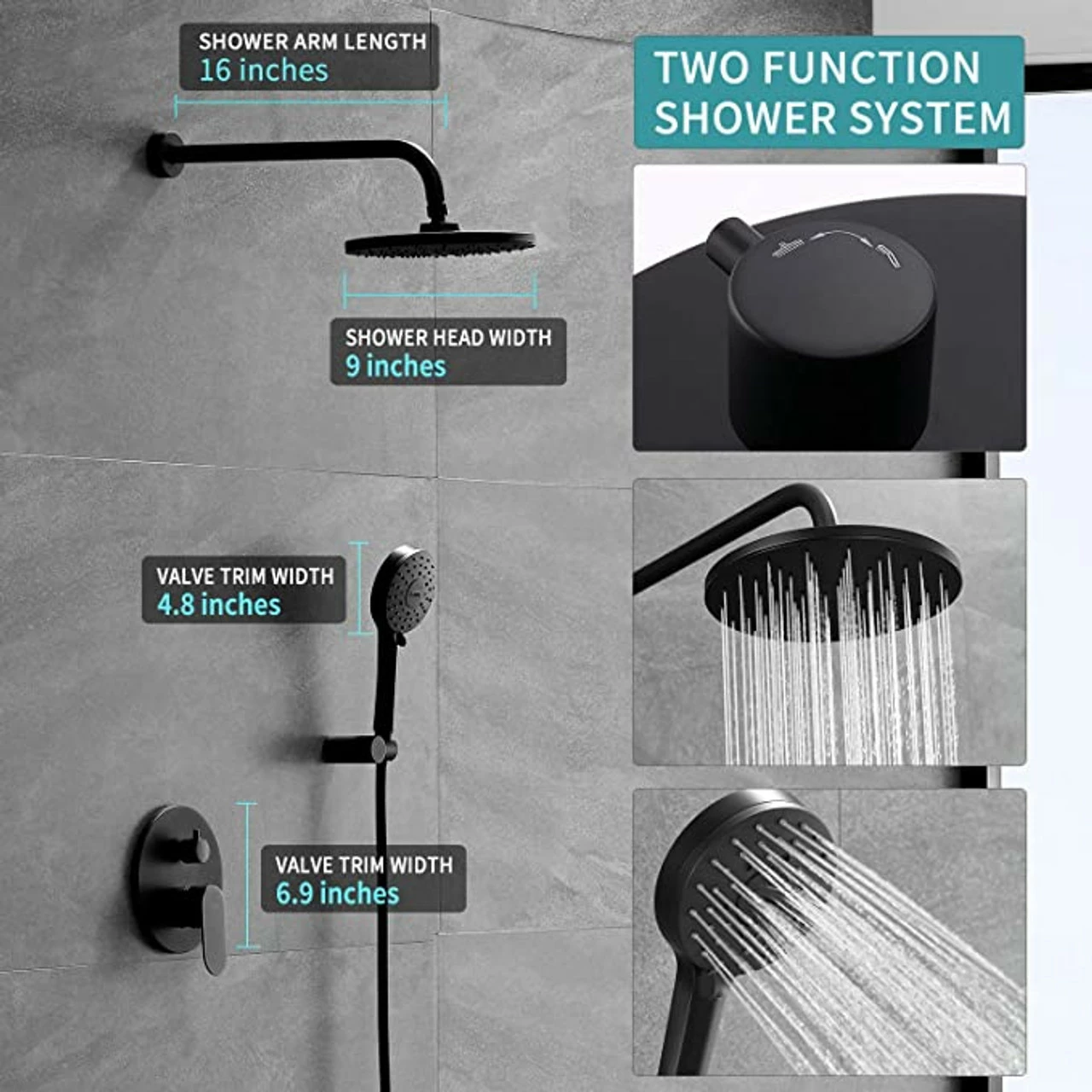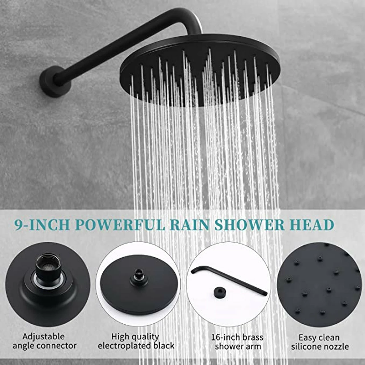 - THE BLACK SHOWER SYSTEM INCLUDE:9 inch rain shower, handheld shower head, 16 inches shower arm, 59 inches shower hose, shower head brakcet, water mixer valve, shower elbow