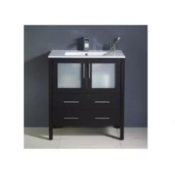 Efficient, elegant, and minimal in design, this vanity is ideal for smaller bathrooms or powder rooms. It features two drawers and a tempered glass cabinet for ample storage, along with soft closing hinges to prevent slamming. Made from solid wood with a ceramic top and sink, it comes with a protective finish to prevent peeling.