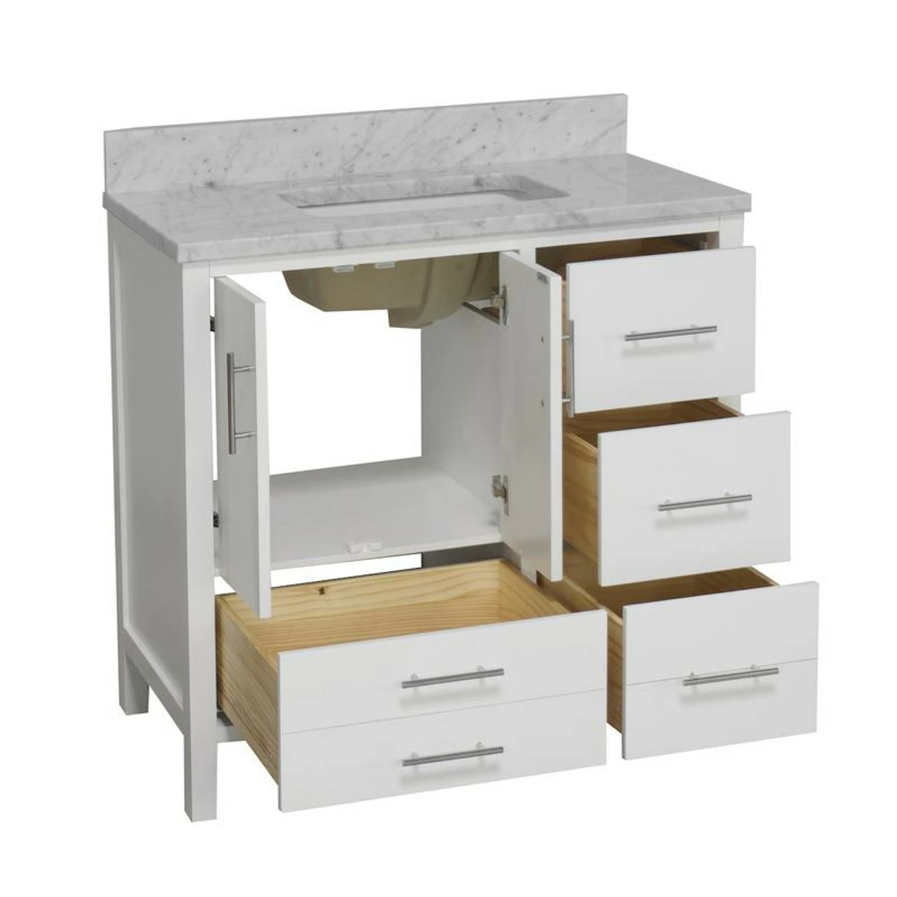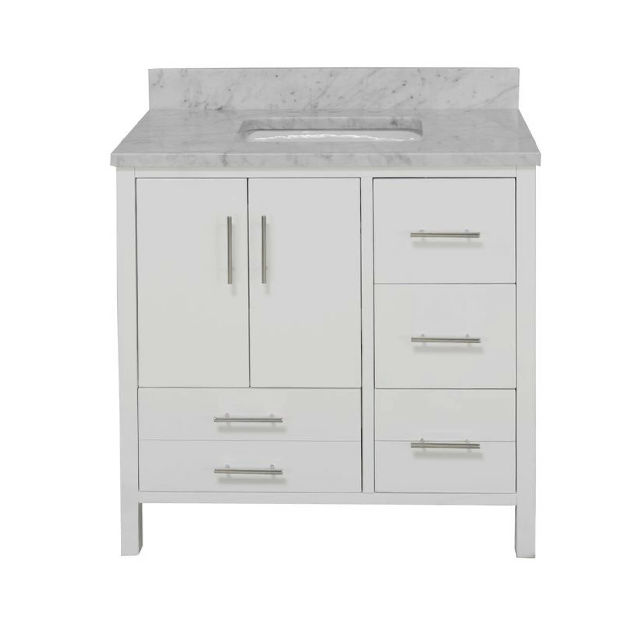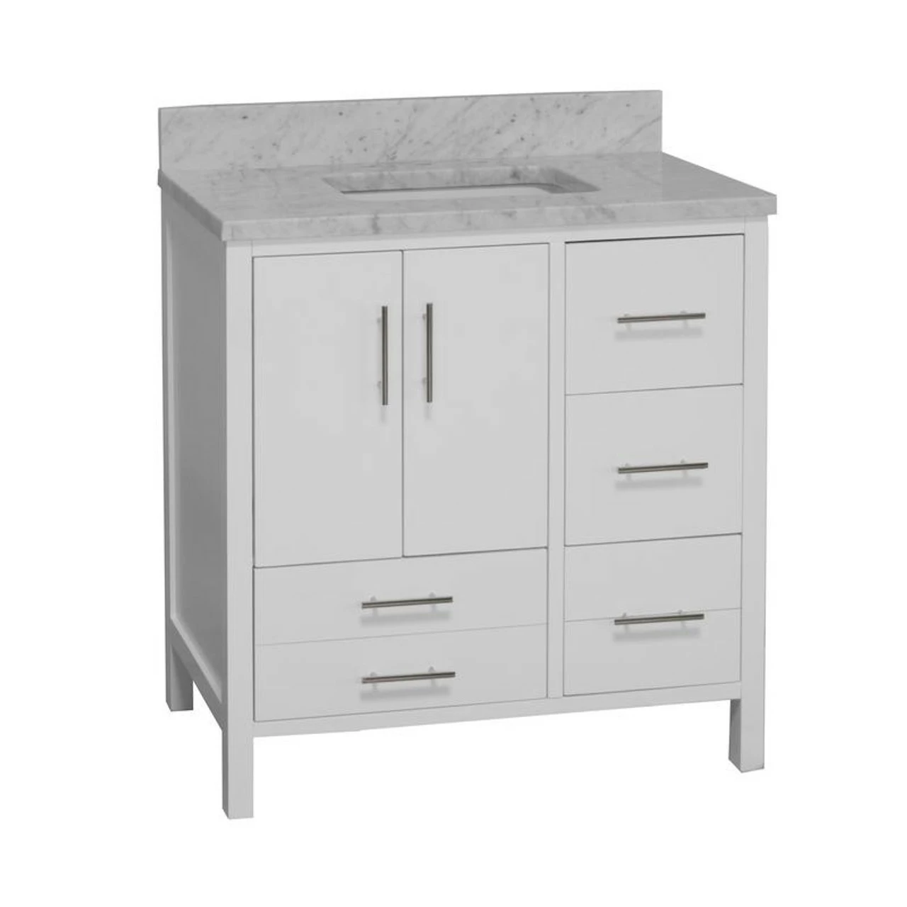 This charming vanity set will fit perfectly in your small bathroom. With its solid wood construction, a gorgeous stone (quartz or marble) top along with an under-mount square white ceramic sink, it gives you the luxury feeling with a comfortable price tag.