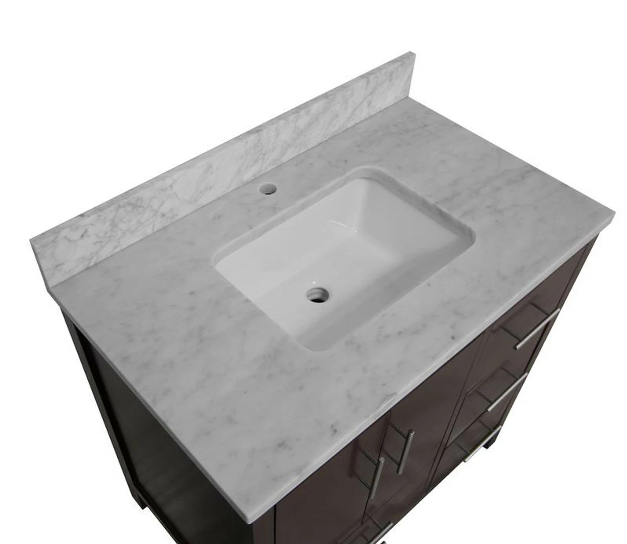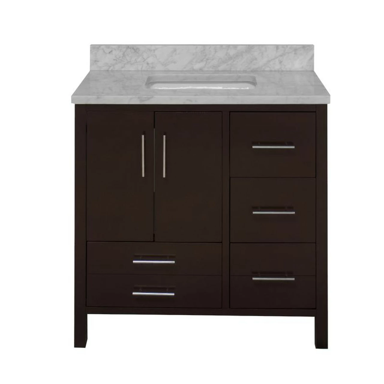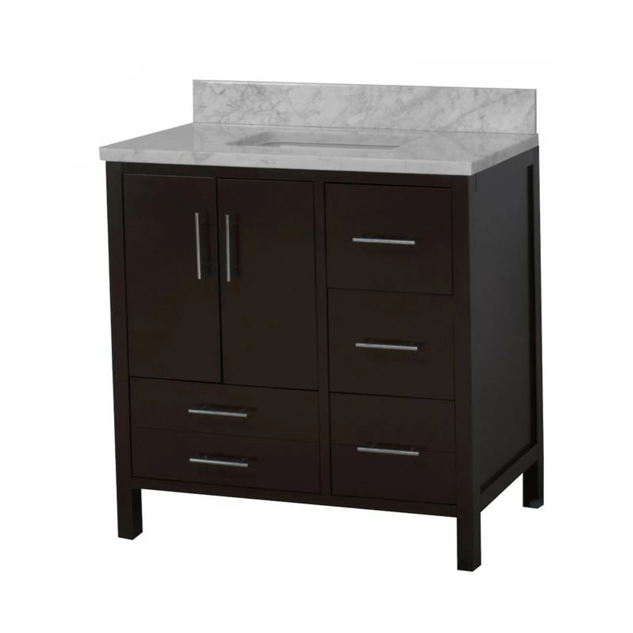 This charming vanity set will fit perfectly in your small bathroom. With its solid wood construction, a gorgeous stone (quartz or marble) top along with an under-mount square white ceramic sink, it gives you the luxury feeling with a comfortable price tag.