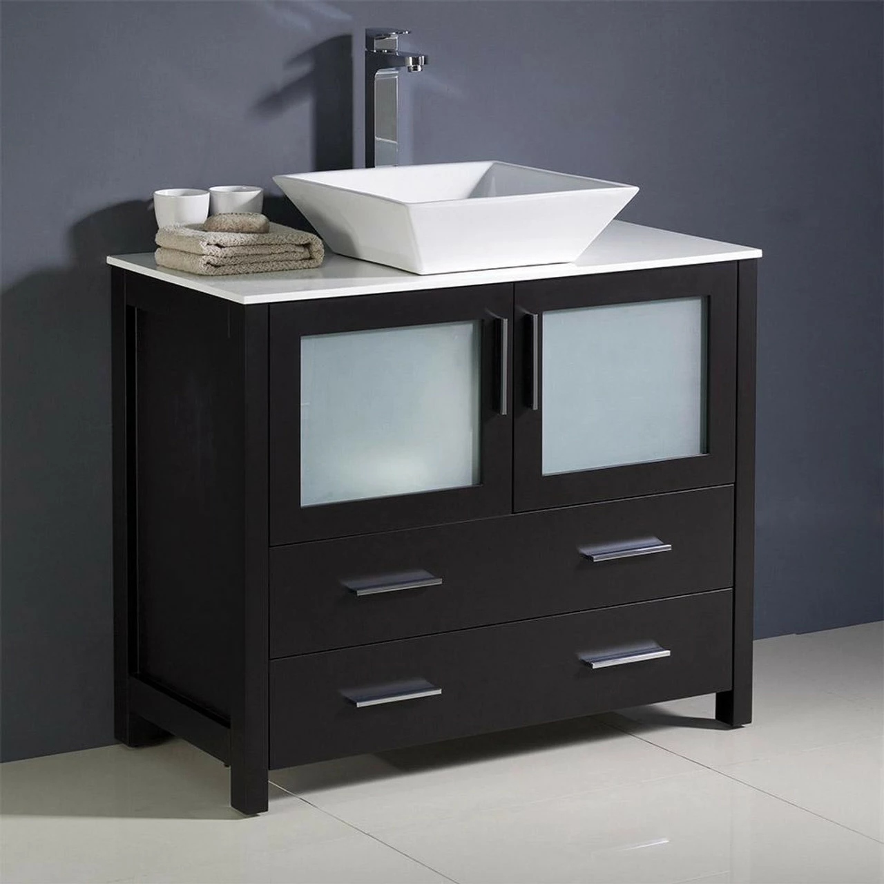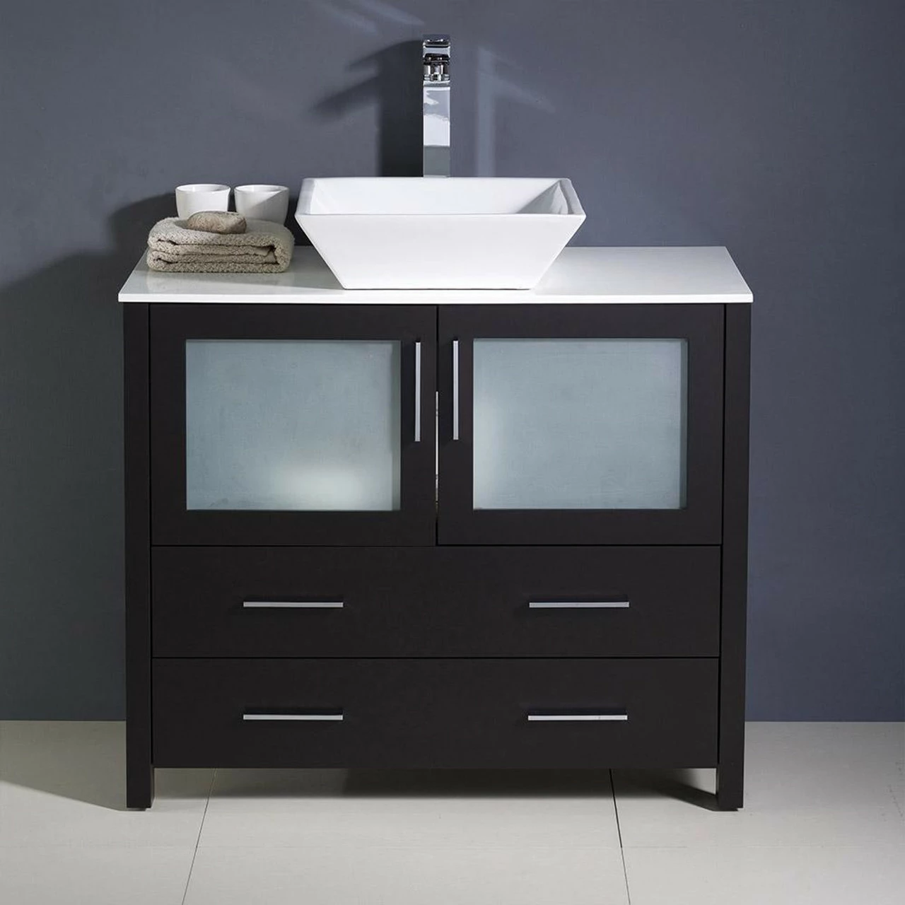The Palmetto 36” Espresso Bathroom Vanity has style to spare. This vanity has glass doors elegantly featured on its cabinet doors. A white ceramic sink and phoenix stone countertop with ample space. For an undeniable modern makeover, the Palmetto has everything you need.