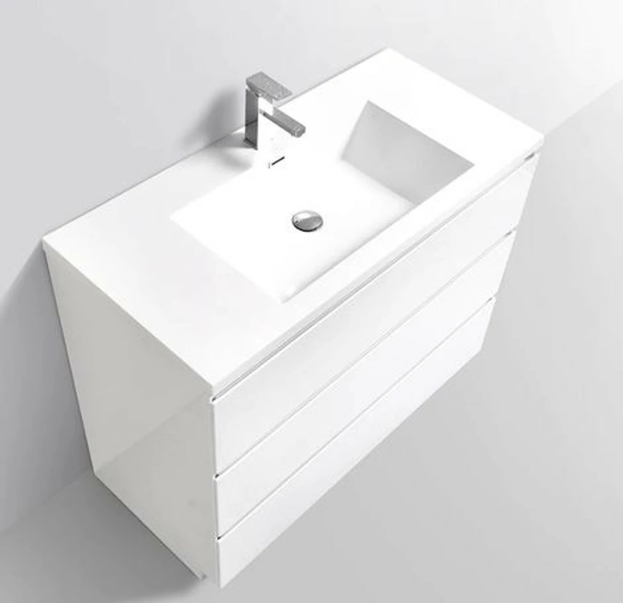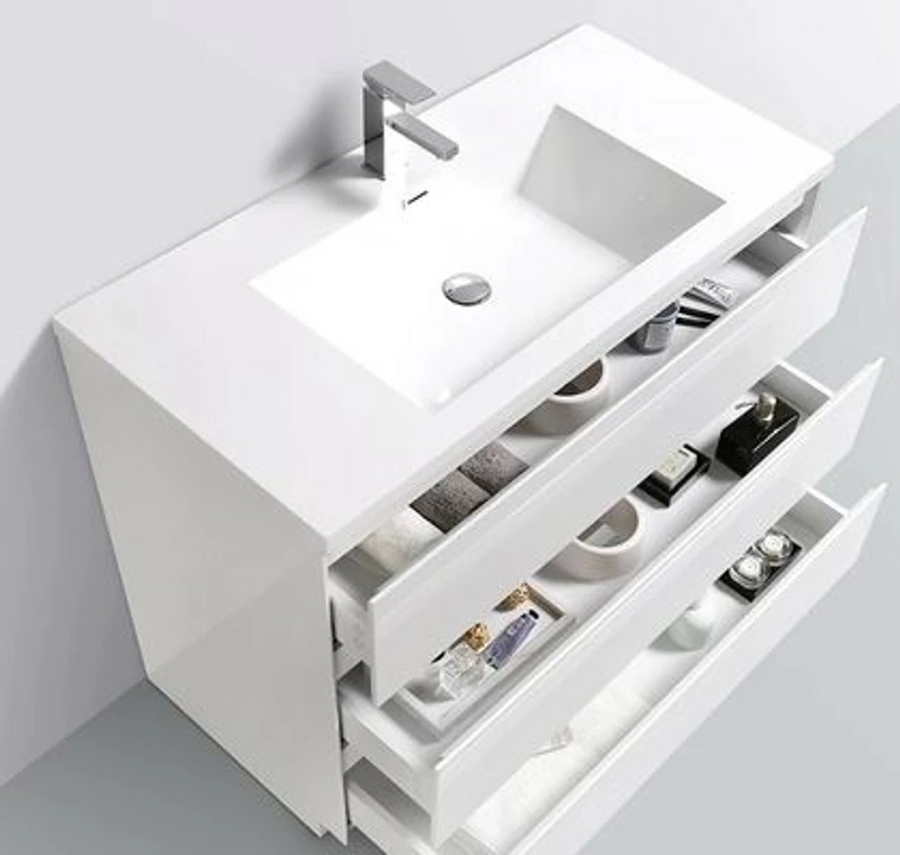 Edison wall mounted bathroom vanity adopts unique design of L-shape edge and 45-degree-angle edge, the frame is only half of its actual thickness from the front side, while the cabinet can bear weight over 220lb.