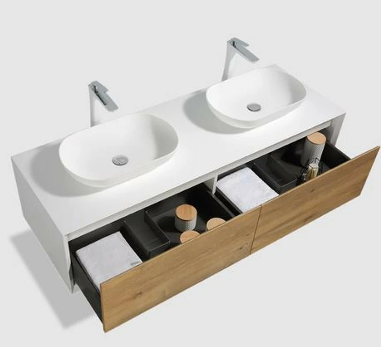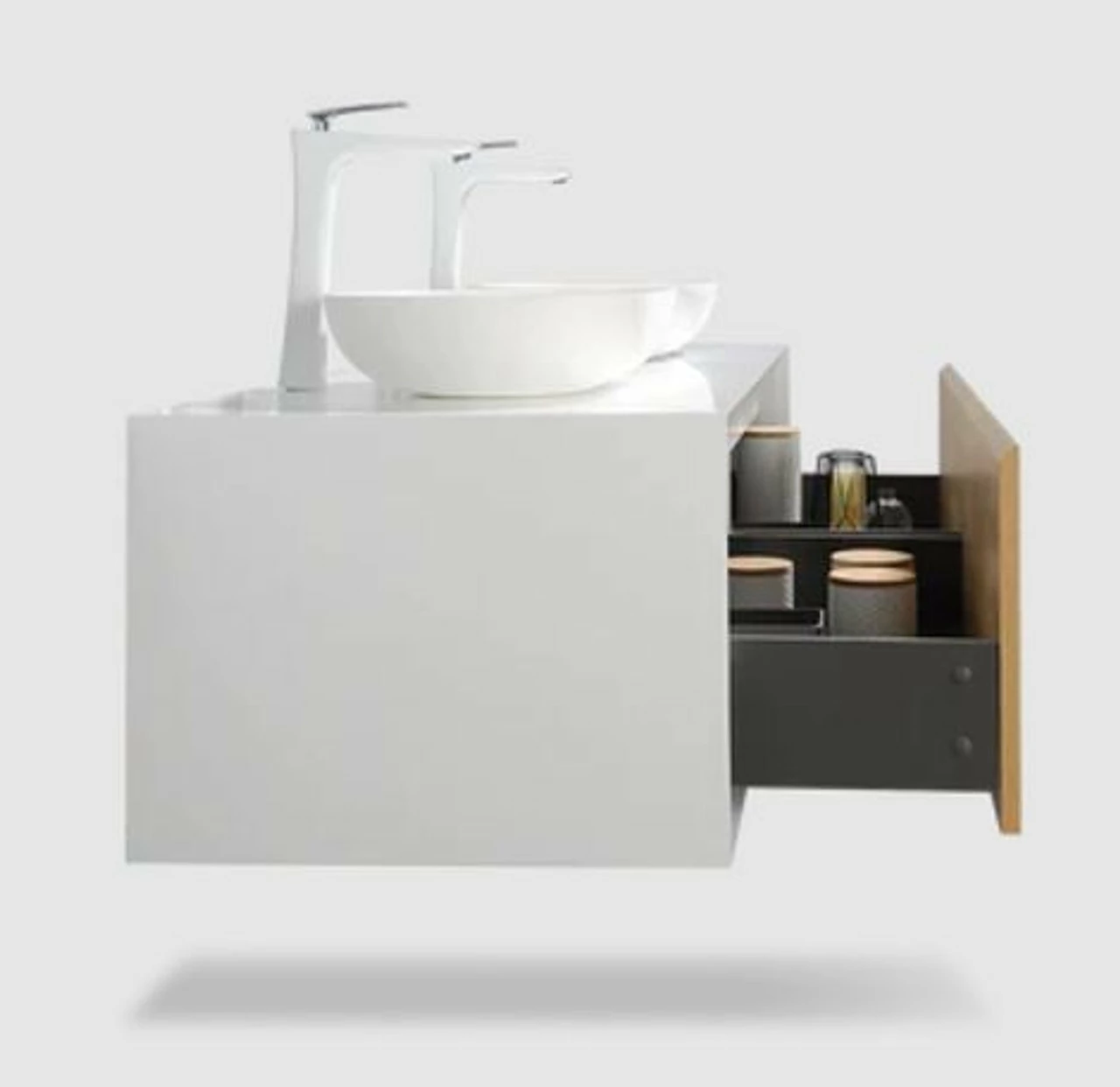 Royal floating bathroom vanity has a high-end white quartz countertop and ceramic undermount sink. With the U shape drawer design, the cabinet has plenty of storage space for all of your washing items. It is easy to be mounted on the wall.