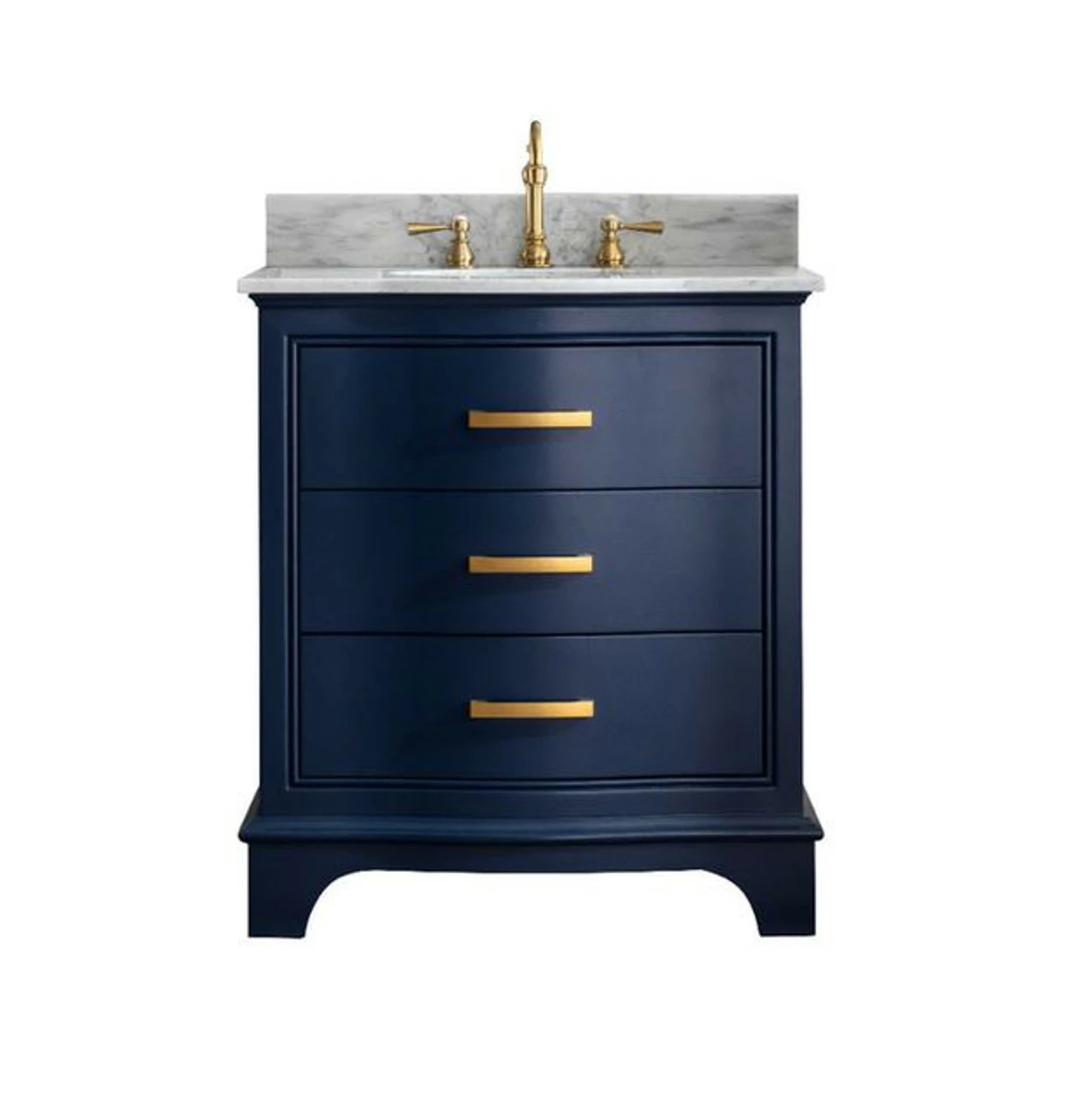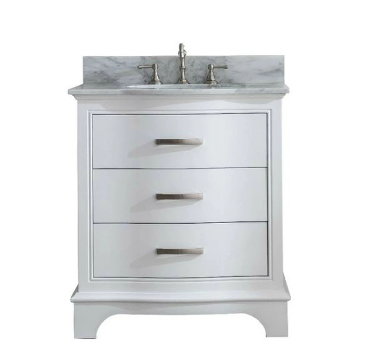 This curved drawer style vanity features elegant lines in a modern contemporary style. Featuring two functional soft close drawers for convenient storage. Paired with a beautiful and carefully selected high-quality Calcutta Quartz top with porcelain under-mount sink. Also available in 24″