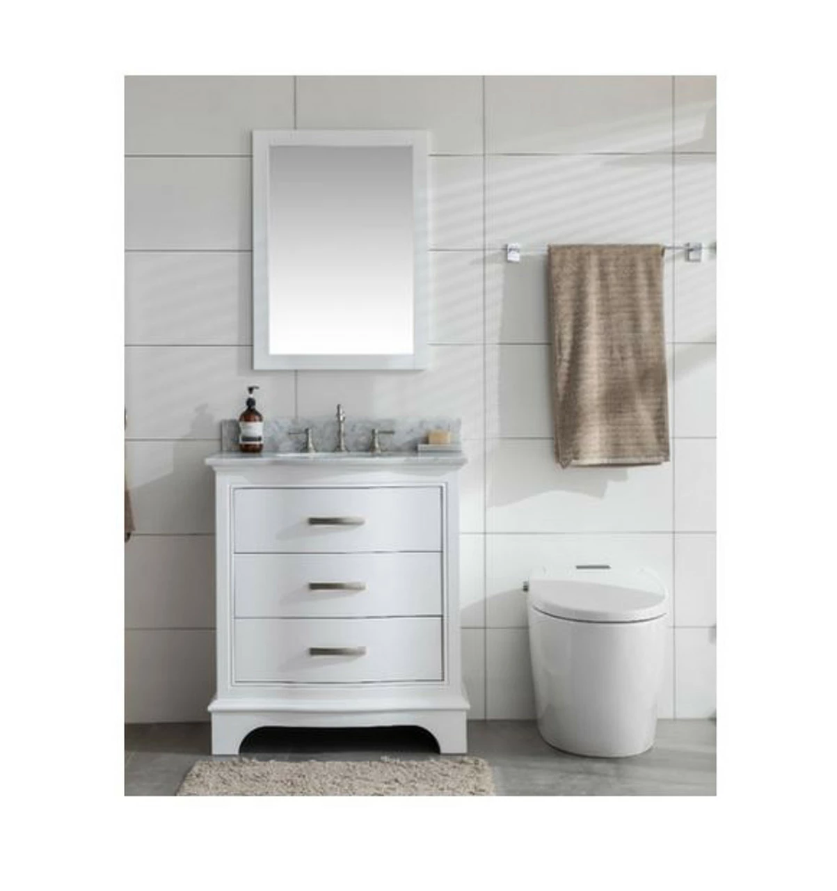 - Solid wood vanity with soft closing drawers and cabinets