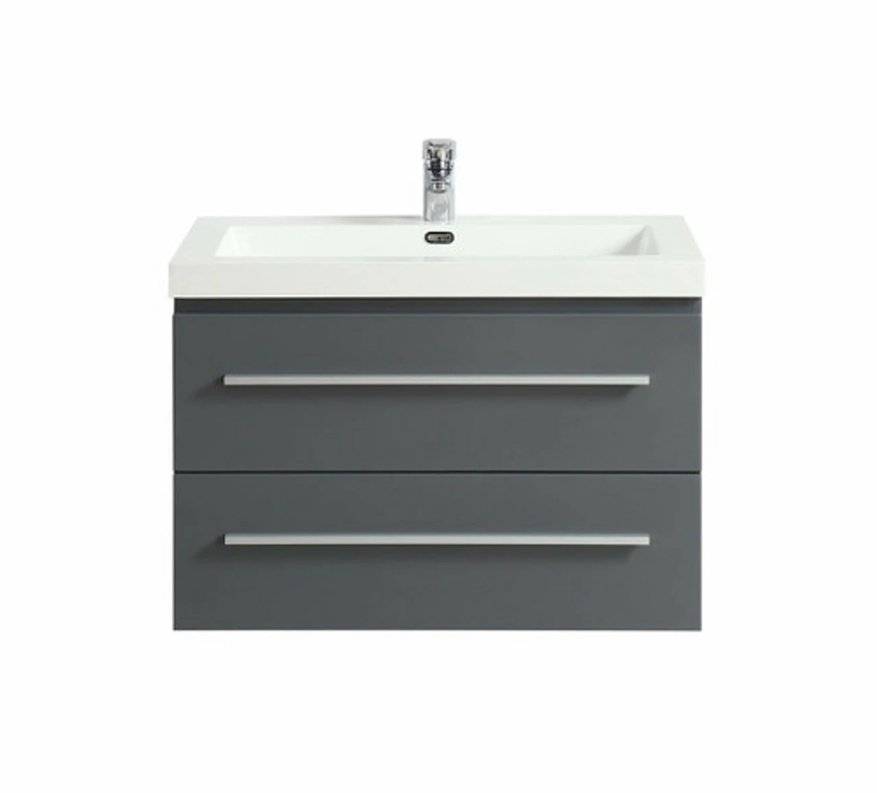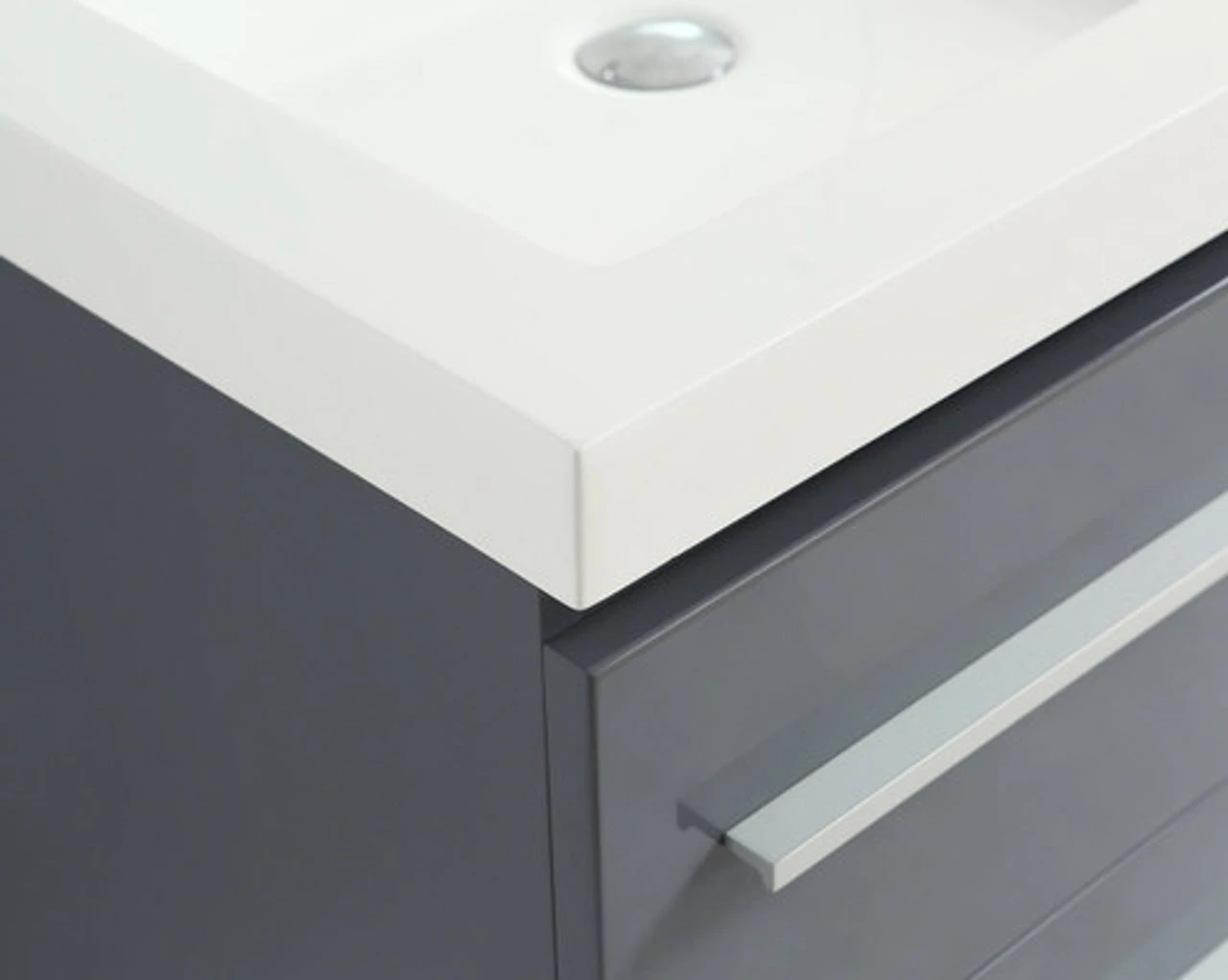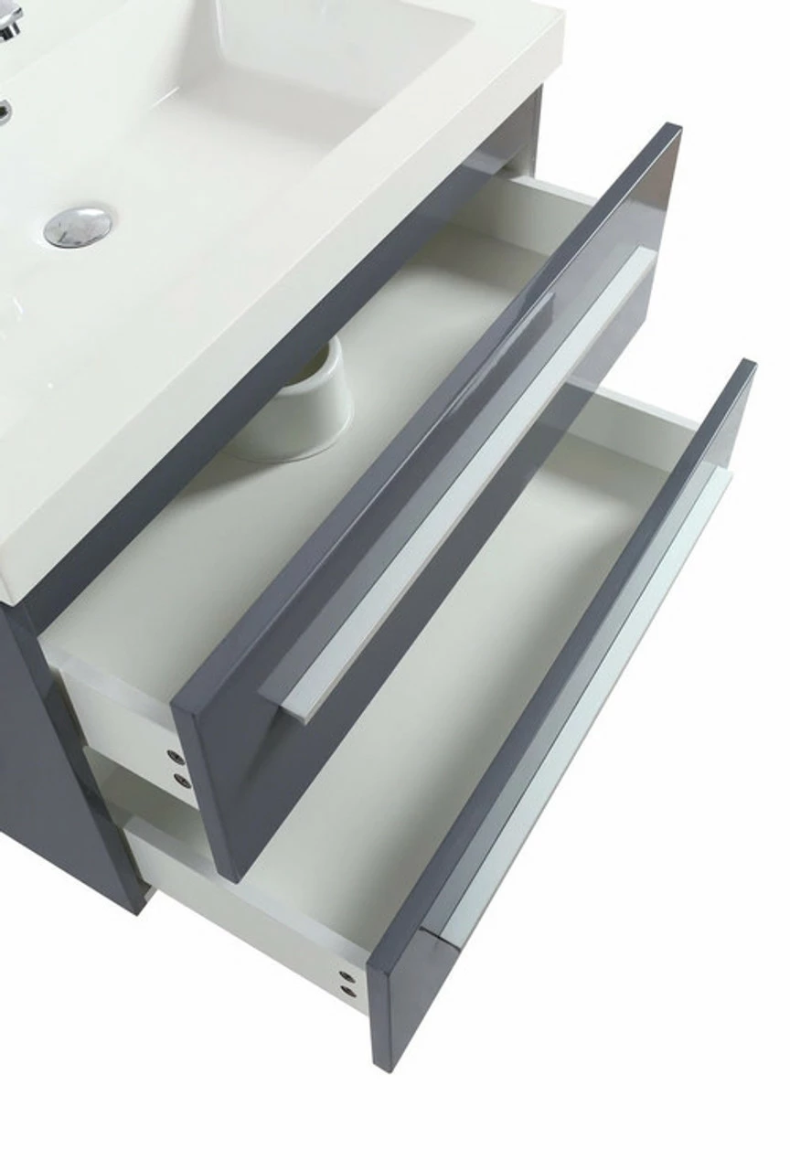 This contemporary styled wall mount is perfect for the modern bathroom. It has a white countertop with a ceramic white sink. Two drawers with soft closing hinges and sufficient storing space.