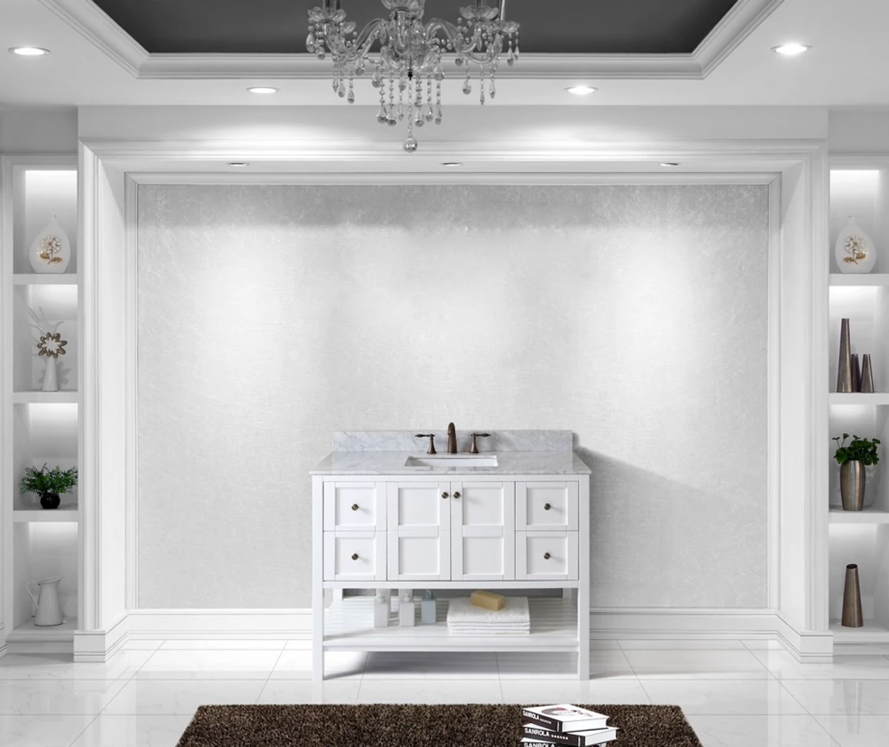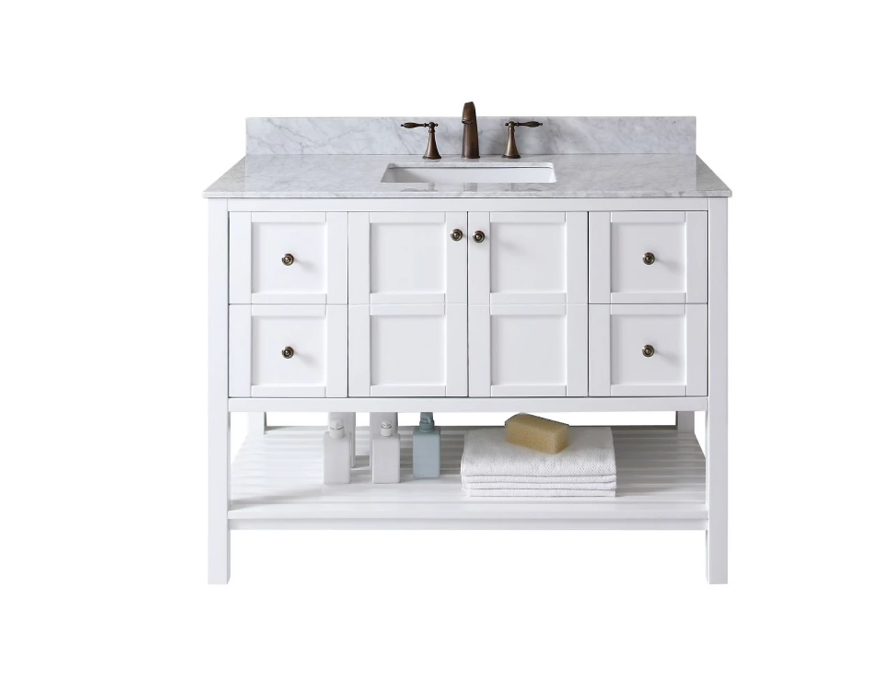 Contemporary meets traditional in this bathroom vanity. Intricate molding on the cabinets and an opening at the bottom for storage. The cabinet has soft close hinges. Made from solid wood with a protective coating and a stone countertop and ceramic sink.