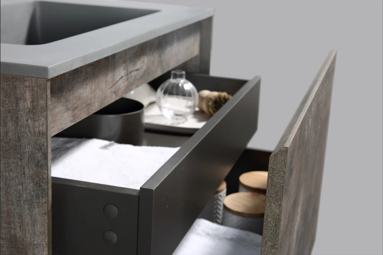 Wood Stained Finish Cabinet with Resin Counter Top Sink with 2 Soft Close drawers.