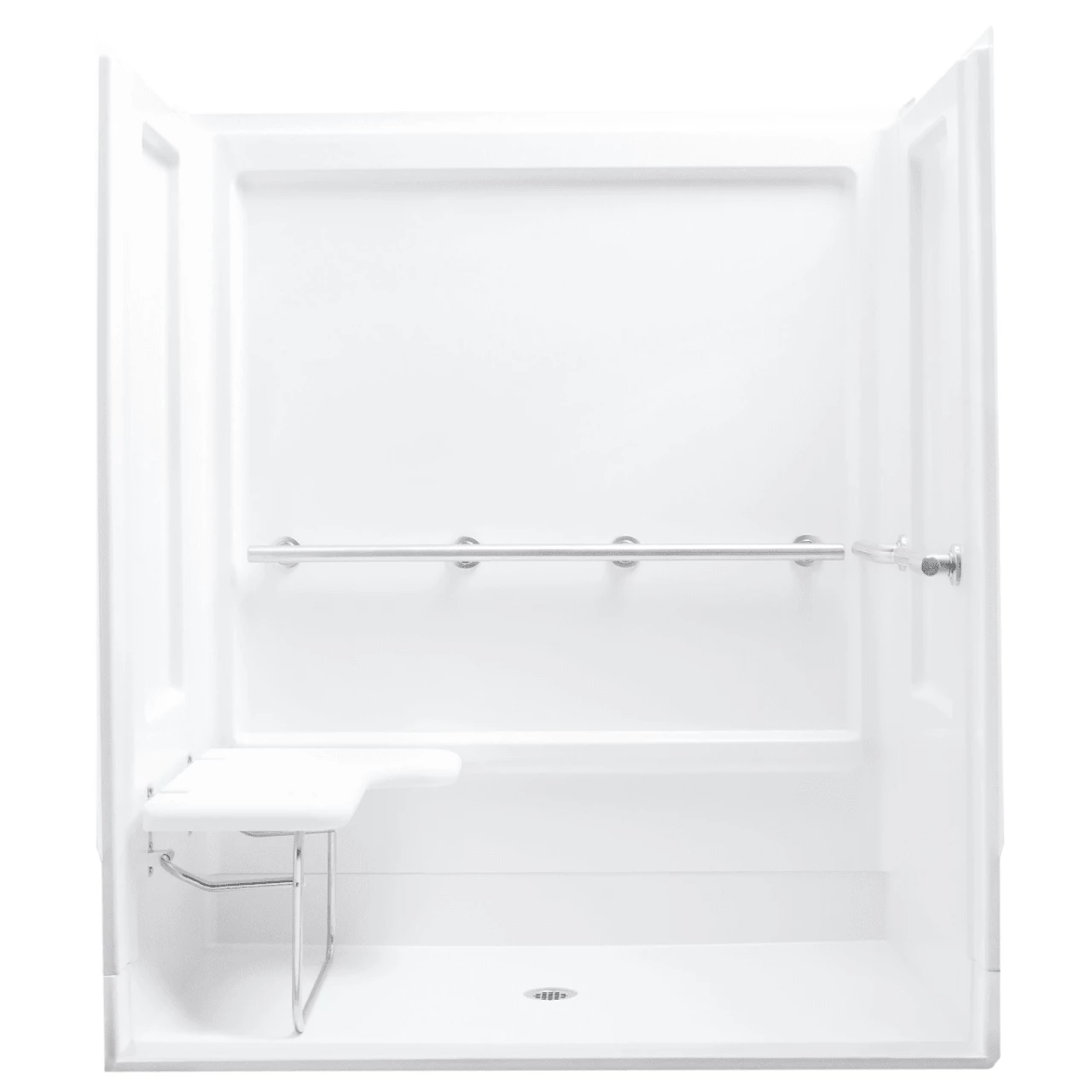 Sterling ADA 63-1/4″ x 39-3/8″ x 73-1/4″ Shower Module with Collapsible Seaton Left, Center Drain, and Grab Bars