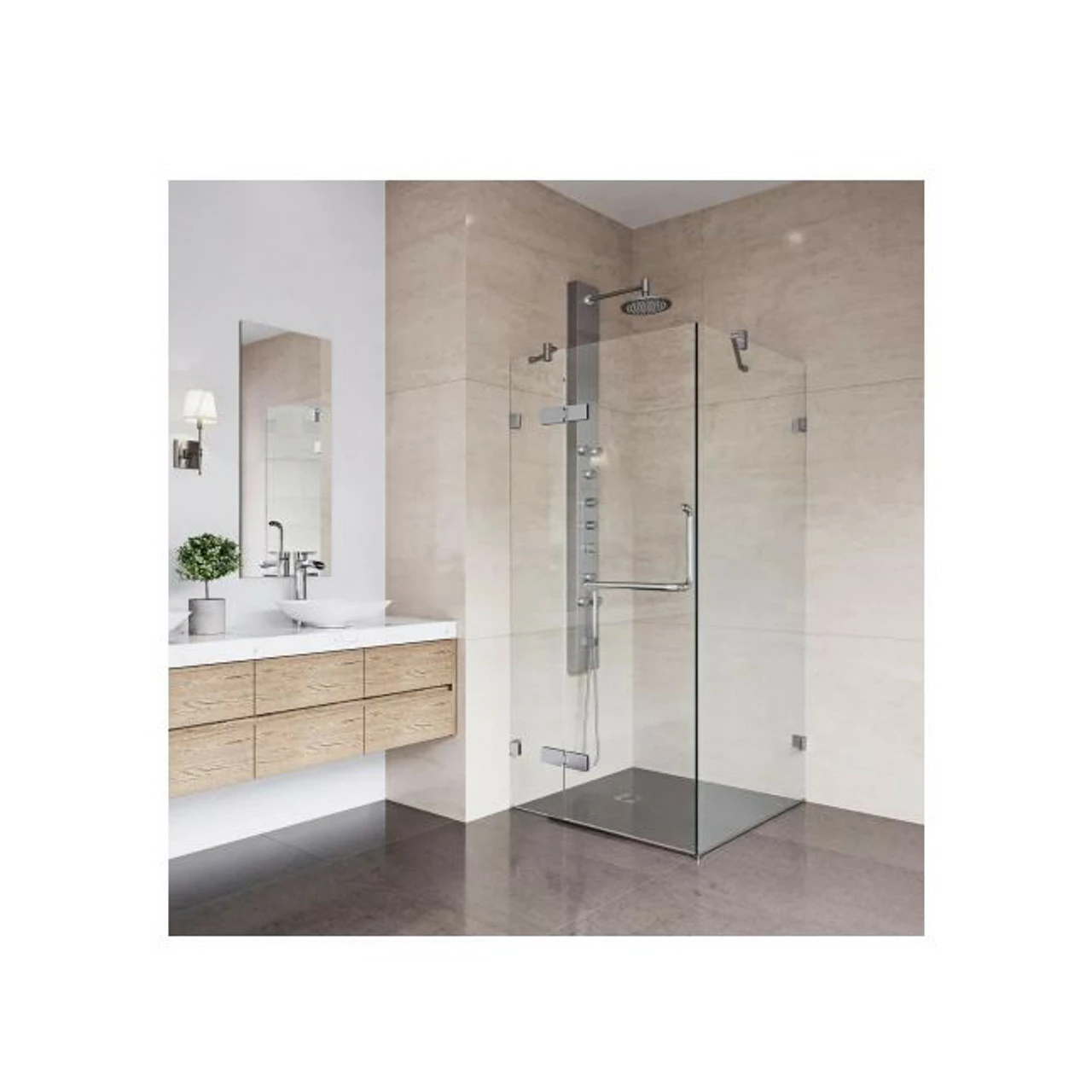 - A frameless design gives a modern, sleek look to the shower