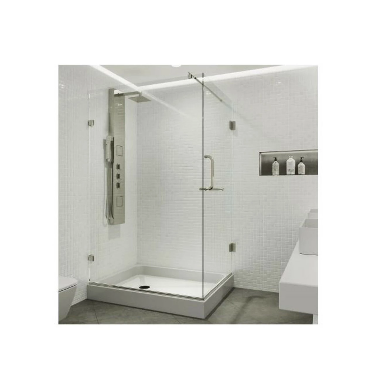 - A frameless design gives a modern, sleek look to the shower