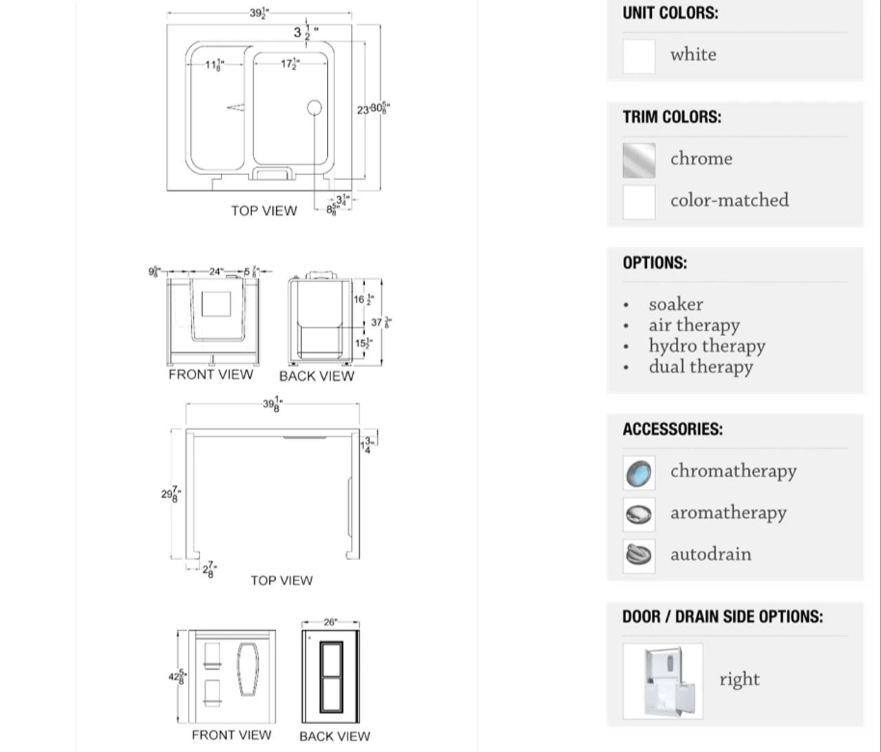 3140RWA* …….. 31 x 40 x 40 …… Air …………………Acrylic ………….. Right/Left ……………..White …………….. $10,670.00
